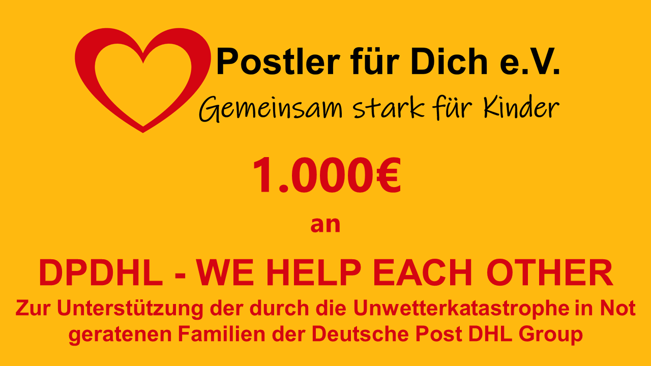 Als Postler für Dich e.V. möchten wir die von der Unwetterkatastrophe betroffenen Familien unserer Kolleginnen und Kollegen unterstützen und haben soeben 1.000€ an DPDHL – WE HELP EACH OTHER überwiesen.
